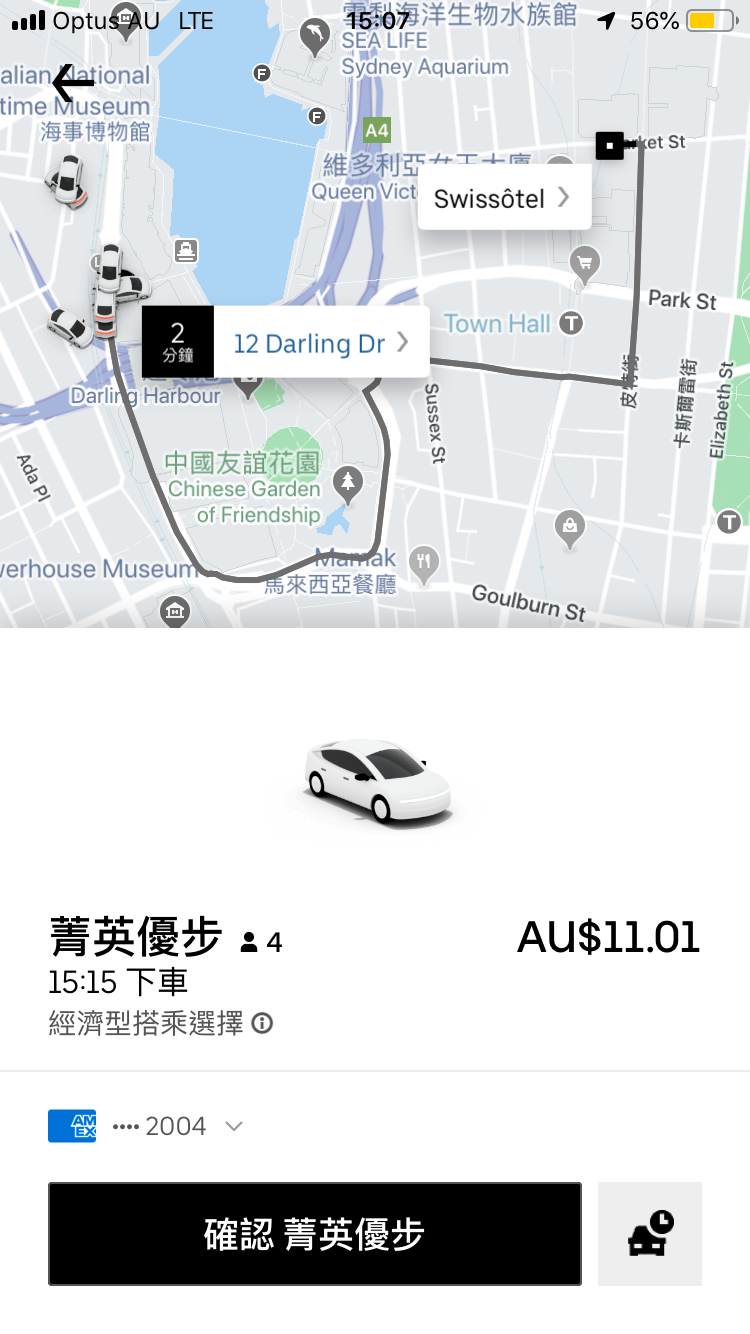 短暫的旅遊天數,只好用金錢換取時間,按下叫車按鈕後,馬上有輛車在一分鐘後到達,兩分鐘的車程費為 11 澳幣(約 230 台幣)。